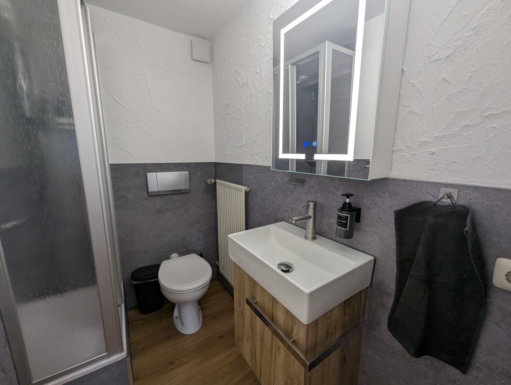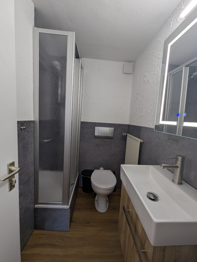The room impresses with its warm colors, vinyl flooring, a spacious clothes rack, and a cozy seating area right by the window with a view of the historic town center of Monschau. These elements give the room a special touch and allow you to take a deep breath in comfort at any time.